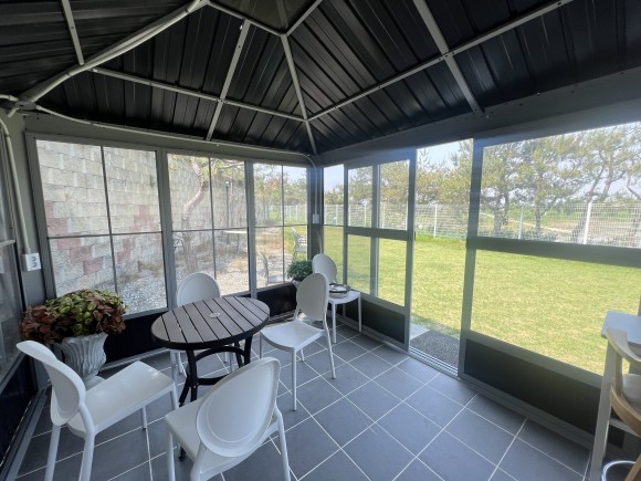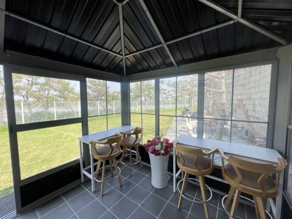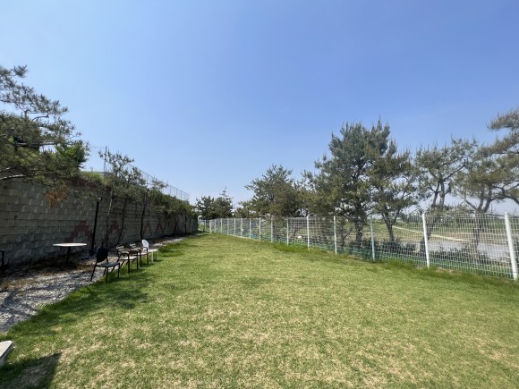 안에는 견주 분들이 편하게 이용하실 수 있도록 의자와 테이블도 세팅해두었습니다. 또한, 밖이 바로 보여서 우리 대형견들이 어떻게 놀고 있는지, 혹시라도 사고는 발생하지 않았는지 바로 체크할 수 있답니다.